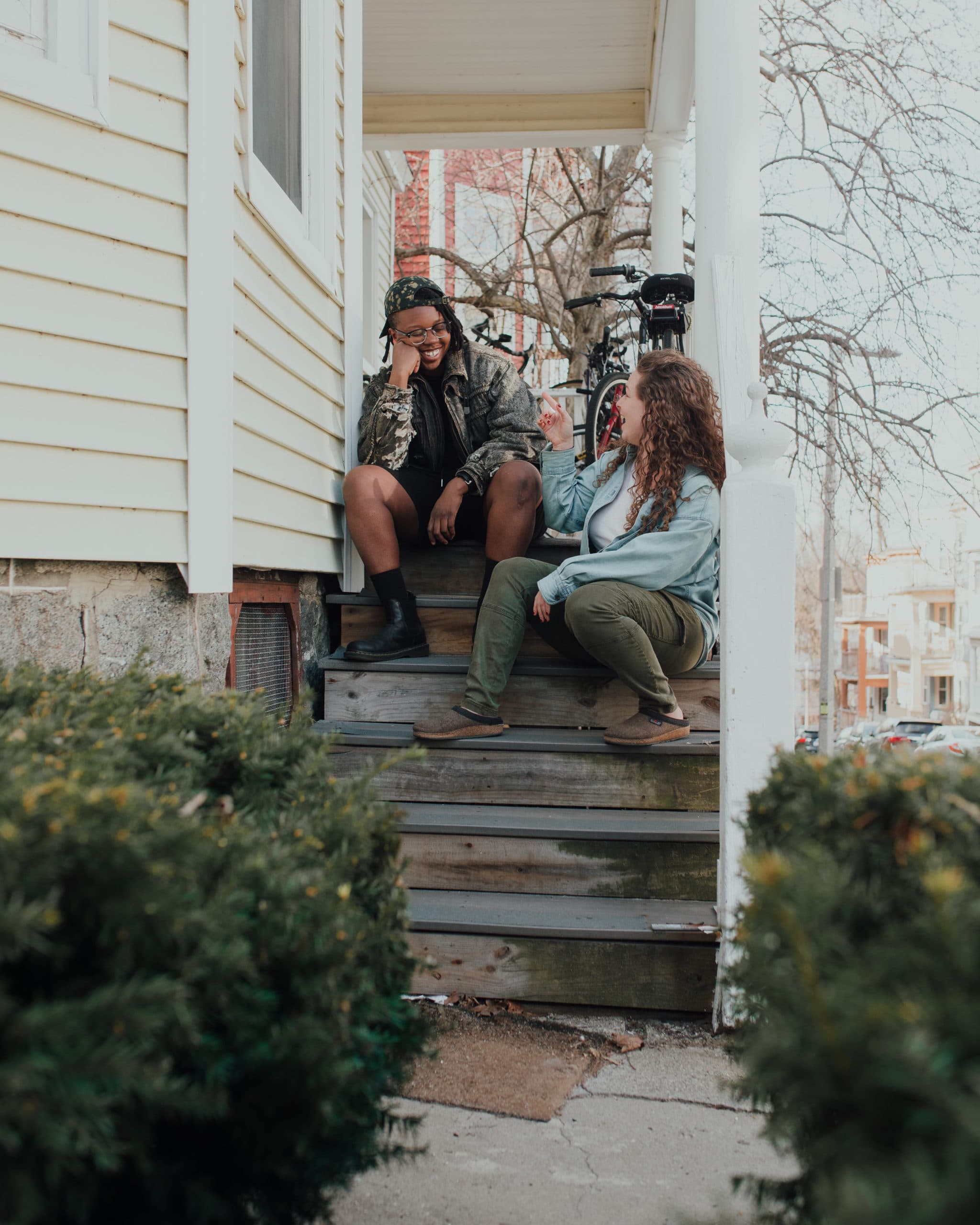 Ally Schmaling, Queerentine portraiture series, 2020, courtesy of the artist. “I asked them all one question: What tiny moments of joy have you found in all of this?” Shana (she/her) & Stacy (she/her), Leah (she/her) & Jahna (she/her) “Almost every night at 6, we meet for porch time with our neighbors. They’re on the 3rd floor, we’re on the 2nd. Sometimes it’s sad, sometimes it’s silly – it’s a way to check in on each other, but, you know, it draws out the whole neighborhood too. It’s like this visible moment of humanity on display.”