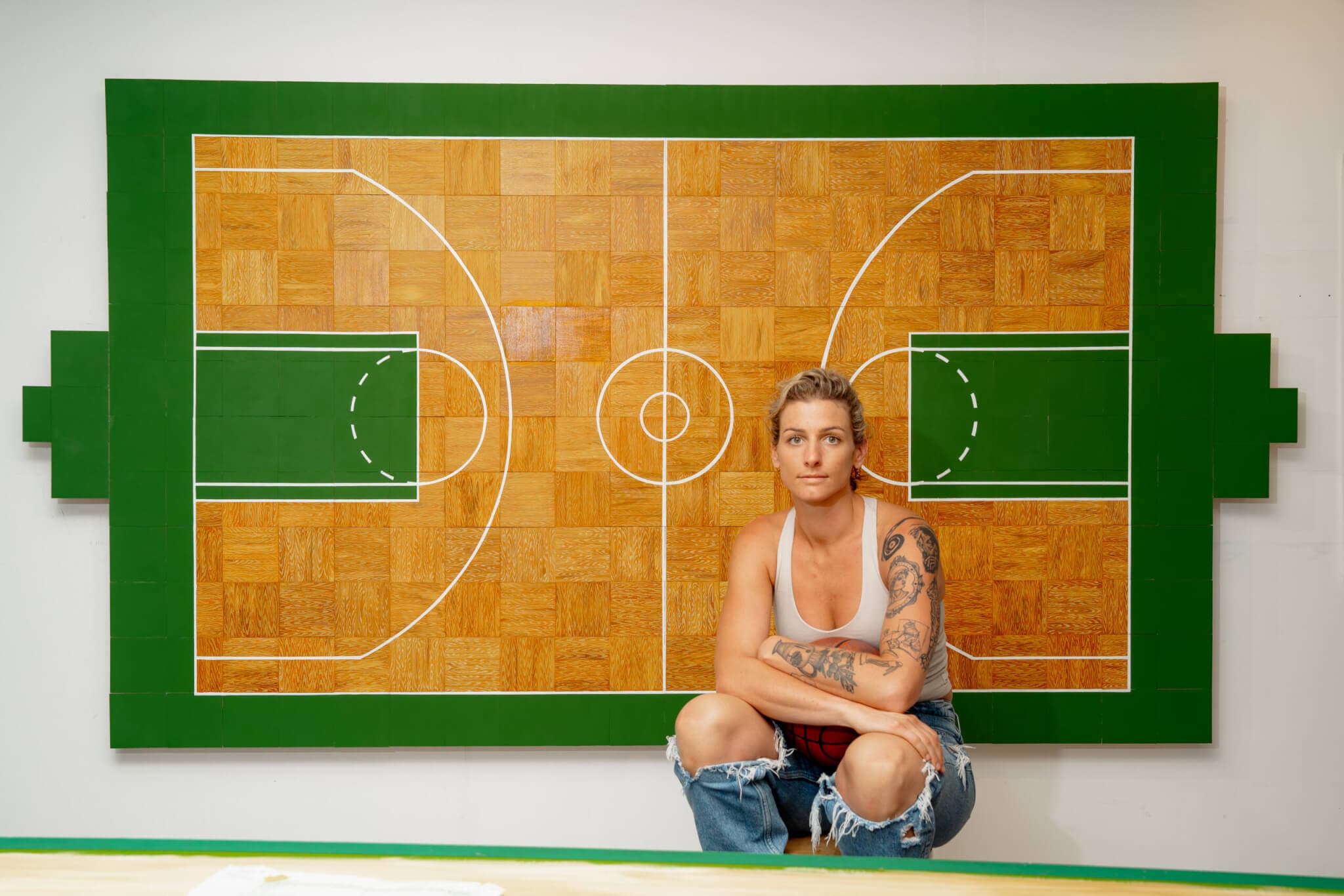 The former Division One basketball player paints iconic courts and fields as sacred surfaces, linking the rituals of church, practice, and art.