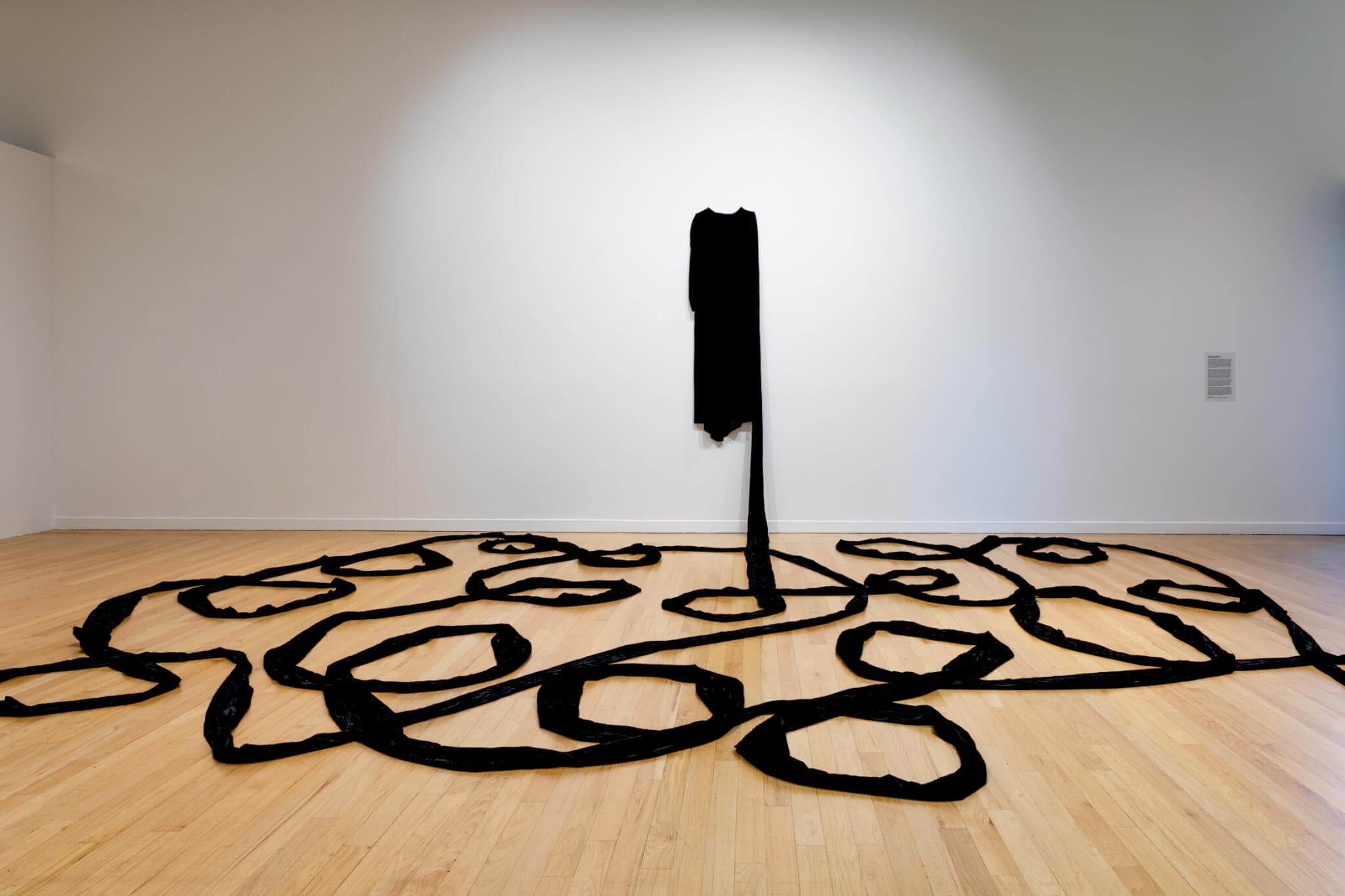 The first section of the exhibition features Semmes’s early installations and wearable sculptures. Buried Treasure (1994), an inky black velvet dress hung ten feet high on the wall, commands TUAG’s opening gallery. One of its sleeves stretches out dozens of feet, the fabric cascading onto and across the floor, where it gathers in loops and coils like an elaborate root system anchoring the garment above. A nearby photograph reveals how Semmes activated the sculpture by situating it within the surrounding environment, just as she had with Boulders. In the photo, an anonymous figure dons the dress, their back to the camera as they look out to the horizon over a glittering body of water. The extended sleeve snakes through the grass behind the figure, its dark coils nearly filling the frame. A red X is emblazoned on the dress—the body turned into a treasure map, as the title suggests.
