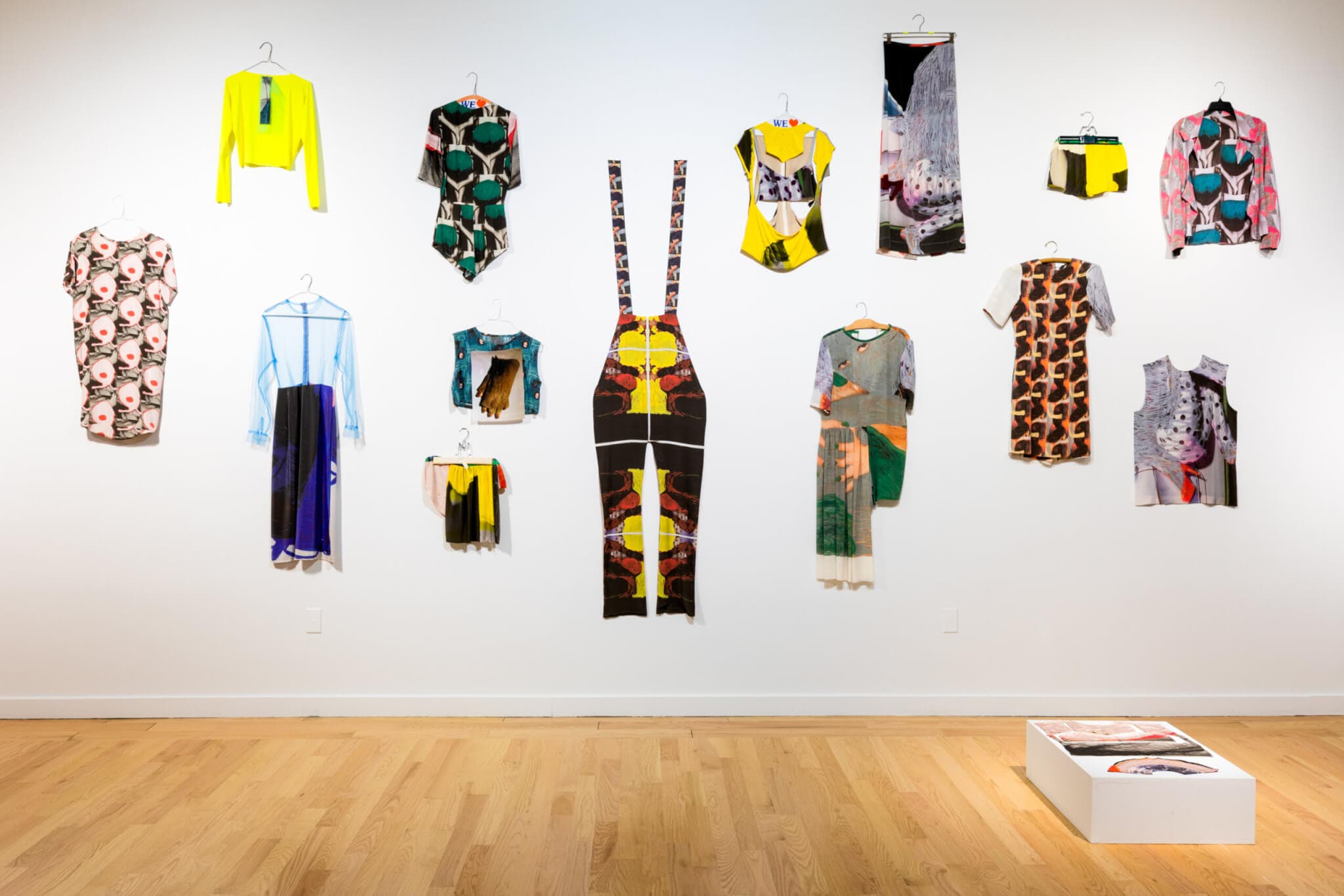 Downstairs, the exhibition closes with a coda featuring the CarWash Collective, Semmes’s collaboration with fashion designer Jennifer Minniti. Images from the Feminist Responsibility Project are printed directly onto fabric and transformed into playful garments that echo the same dynamics of exposure and concealment that structure FRP. A projected video captures these outfits being paraded down a catwalk, accompanied by Semmes’s lumpy ceramics repurposed as unconventional accessories. This project represents another contextual shift for Semmes’s work, operating simultaneously within the world of fashion design and the gallery’s critical framework—an apt conclusion for an artist who has always thrived in the spaces between categories.