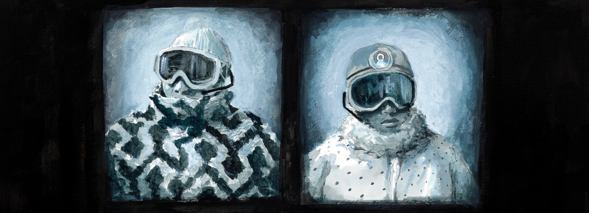 Look at one of Ethan Murrow’s deckle-edged graphite drawings, and you’ll find precise details—the shine on the grommets of a shoe, the cinch on the wrist of a winter glove. In the background, an atmospheric weave of cross-hatched lines dissolves into soft focus, a quality that, from just a few feet away, could be mistaken for the work of a black-and-white film camera. The intricacy and photorealism of these often surreal scenes are the result of elaborate preparation. Before pencil touches paper, Ethan develops source material using research, props, costumes, photography, and performance. As the leading actor in most of his narrative illustrations, he often dons a suit coat or patterned blazer and a lush headdress of plants.