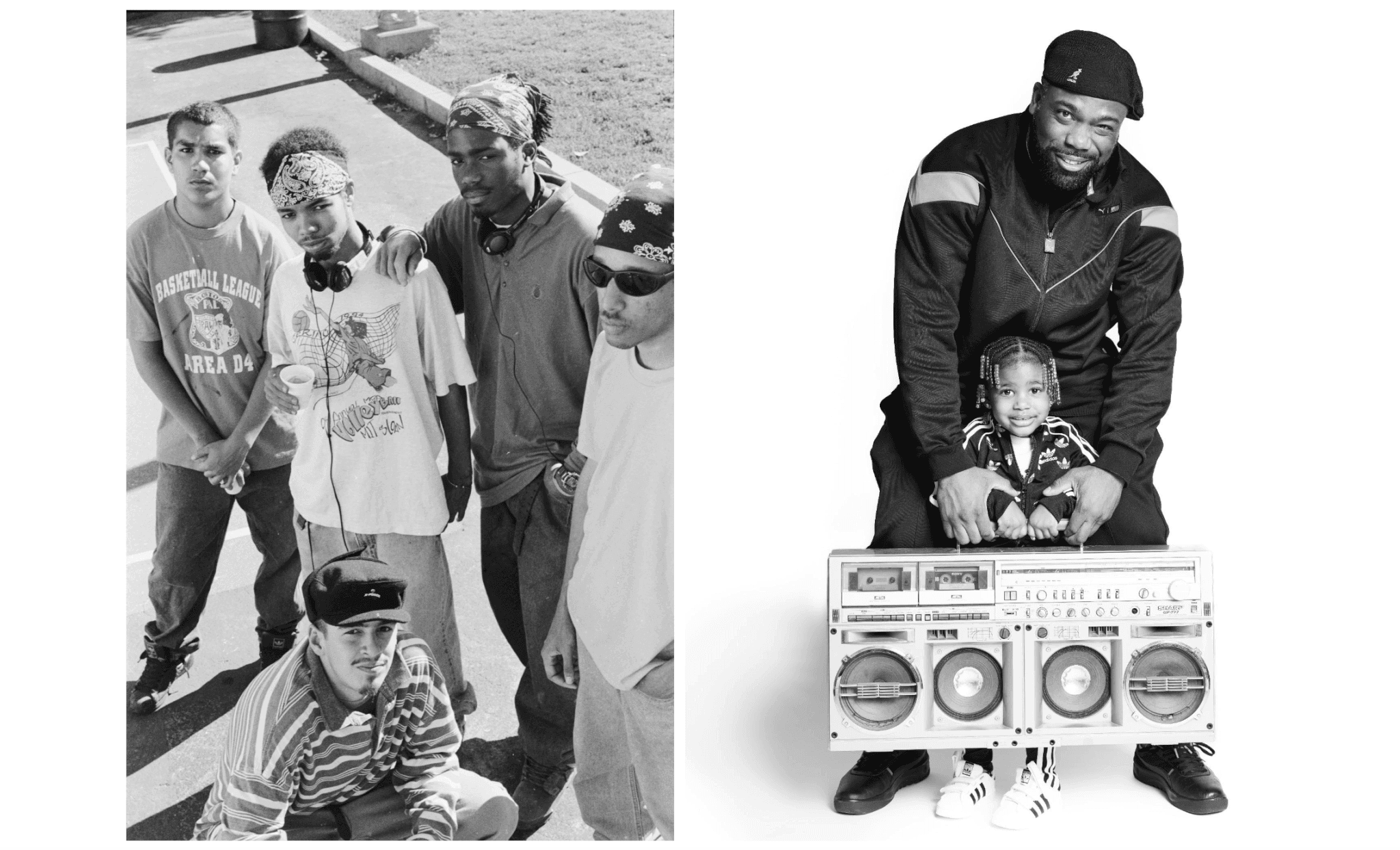 (left) John Brewer, ProBlak, Rezume, FERB, Klue, 1995. Peter’s Park Handball Court, South End. Courtesy of John Brewer. (right) Gabriel Ortiz, ProBlak & Bobbi with Boombox, 2021. Breathe Life Together Photoshoot. Courtesy of Gabriel Ortiz.