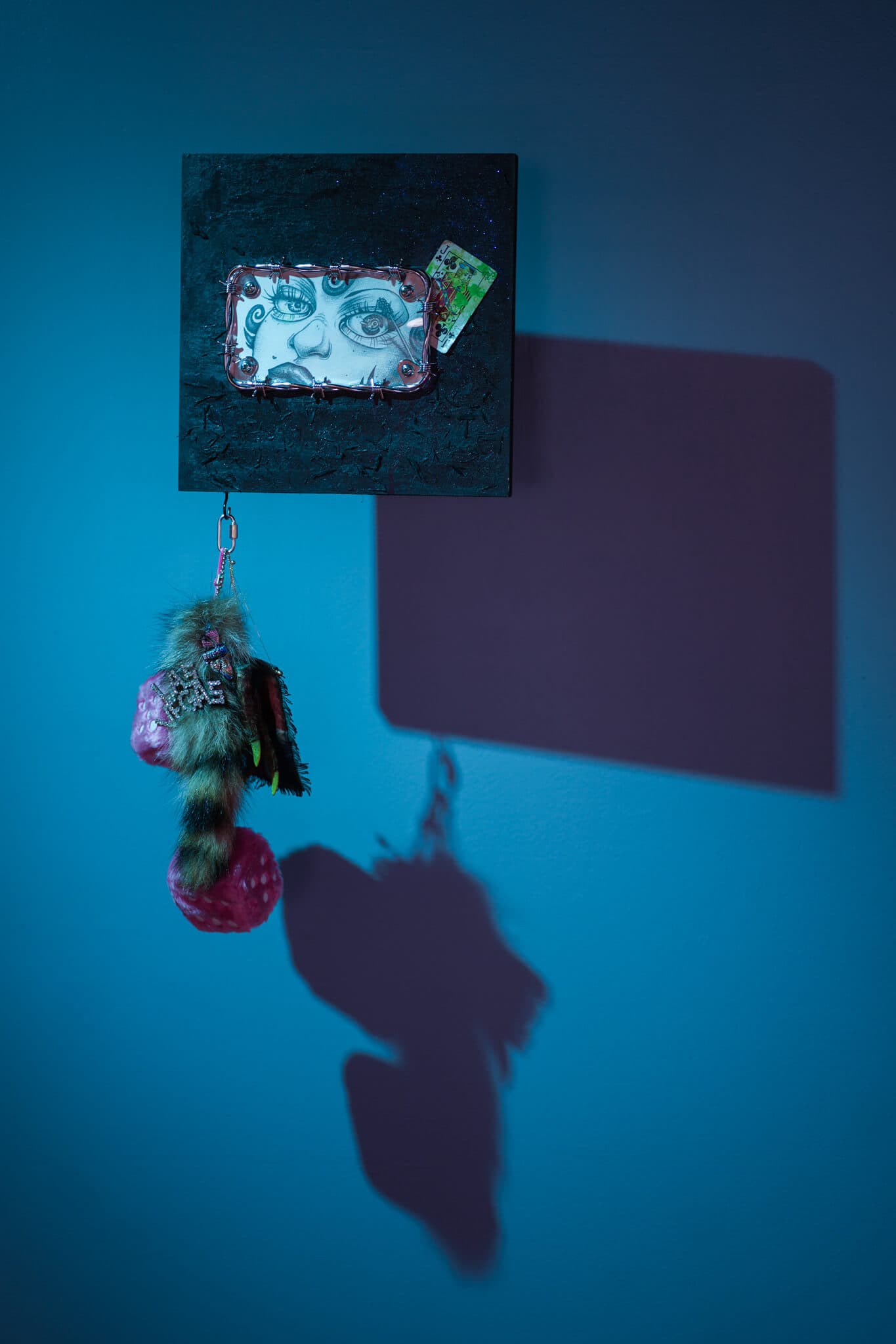Rixy, Check Ya Self, 2024. Acrylic, pencil, paper, tire shreds, and found charms. Courtesy of Essex Art Center.