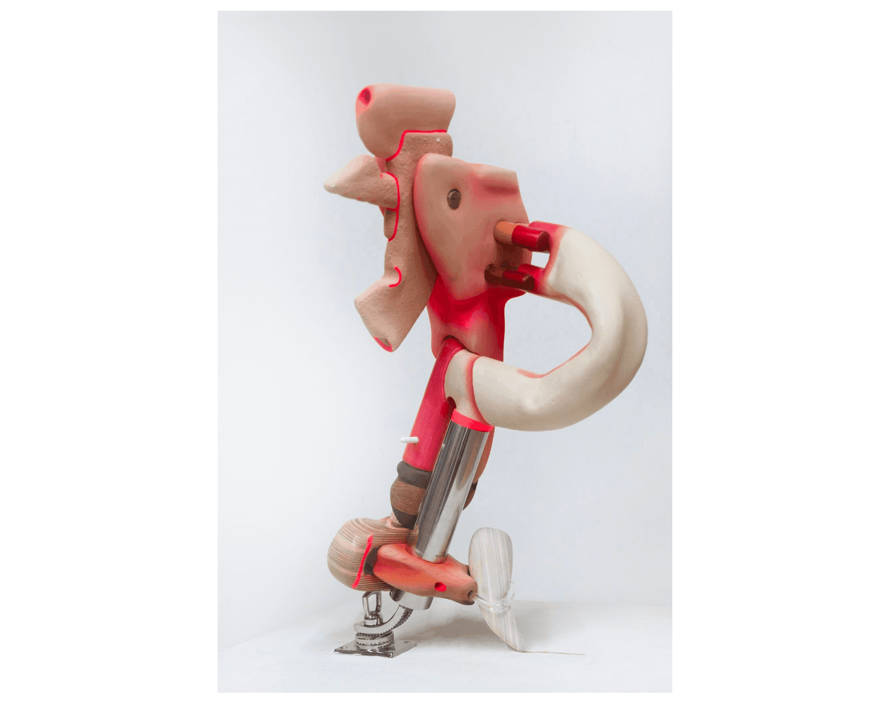 In her latest body of work, “Peripheral Decoys,” Cathy Della Lucia brings her signature style to a new collection of quirky, abstract sculptures. Pieced together with myriad materials—various types of reused wood, ceramics, and paraphernalia from her favorite pastimes (e.g. racquet sports and freshwater fishing)—these textured sculptures make for a fascinating viewing experience regardless of the angle at which you look at them. In that looking, one gets the sense that Della Lucia intends for the pieces to be touched, picked up, taken apart, and put back together to form something different entirely. Indeed, her practice is as much about disassembling as it is about assembling. This ability to shapeshift is not only integral to the integrity of the work but to Della Lucia as a Korean American woman, the sculptures acting as not only a mirror image of a fragmented identity but as an extension of the artist herself.