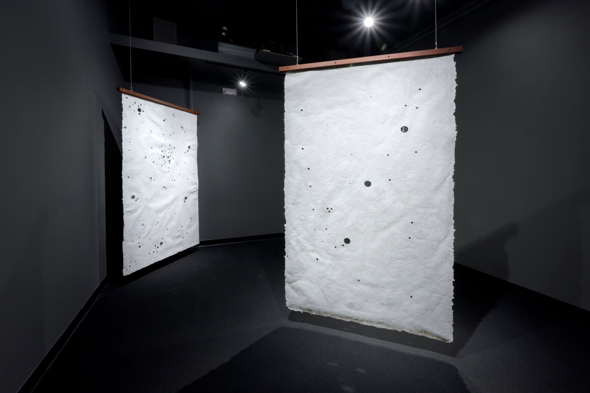 In a neighboring gallery with dark gray walls, Surface Embellishment I and II (both 2024), composed of handmade kala cotton paper, hang suspended diagonally from the ceiling. Their textures and embedded mirrors catch the light, reflecting it outward like fragments of the cosmos. This motif repeats throughout the exhibition—mirrored surfaces appear in one of the large textile panels and in two embroidered works that, at first, seem purely decorative. Wall text reveals that these mirrors are based on aerial photographs of a village in Kutch renowned for its embroidery and handicraft traditions.