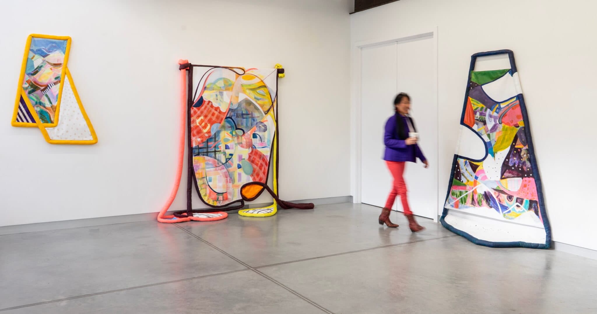 Bold colors, nontraditional shapes, and approaches to negative space challenge the conventions of form and the boundaries of the work in Jai Hart’s “The Walls Wanted to Play Too: The Architecture of Tenderness.” This showcase of new works expands upon the artist’s practice of abstractly recording the geographies of her personal memory and remains true to Hart’s signature method of combining painting, sculpture, and installation. Love Me, Loves Me Not, Loves Me (2025), for instance, incorporates painted tubes stuffed with poly-fil to bring a three-dimensional element to the canvas. At times the tubes carve into the colorful central canvas, outline it, and even anchor it by engaging the floor space in front of the exhibition wall. While at Overlap, visitors have the opportunity to see “Slip,” a concurrent show of works by artists Olivia Baldwin and Barbara Owen, who share Hart’s commitment to forward-thinking multimedia arrangements. —Alisa Prince